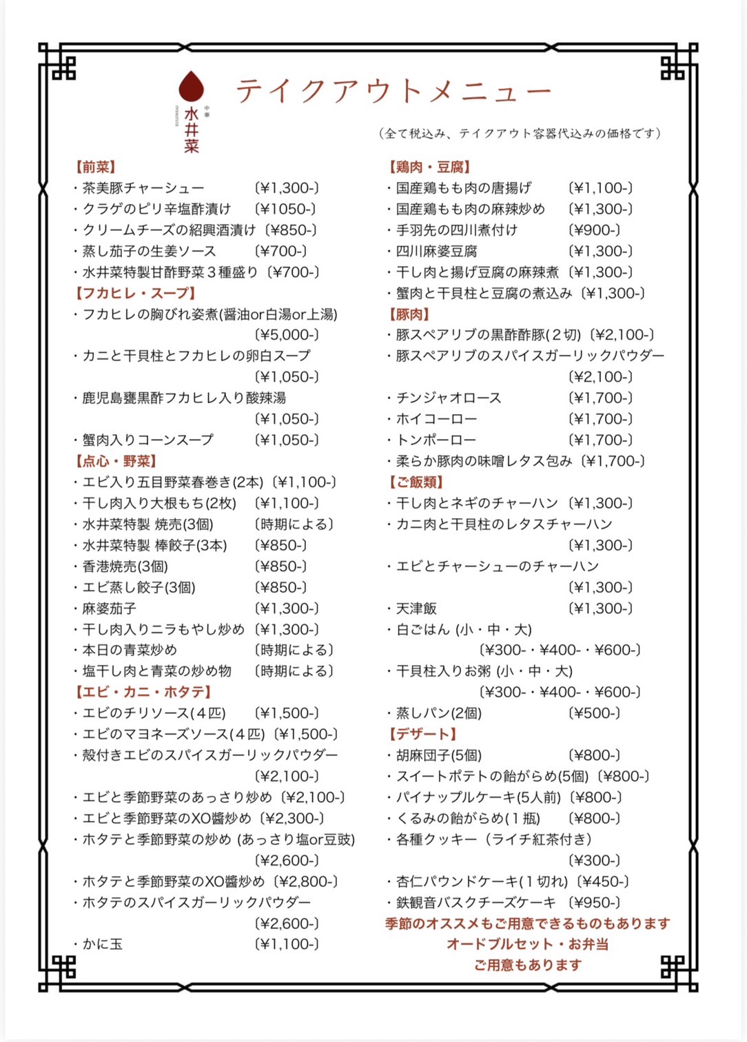 メニューまたは下の表よりテイクアウト商品をご参照ください。