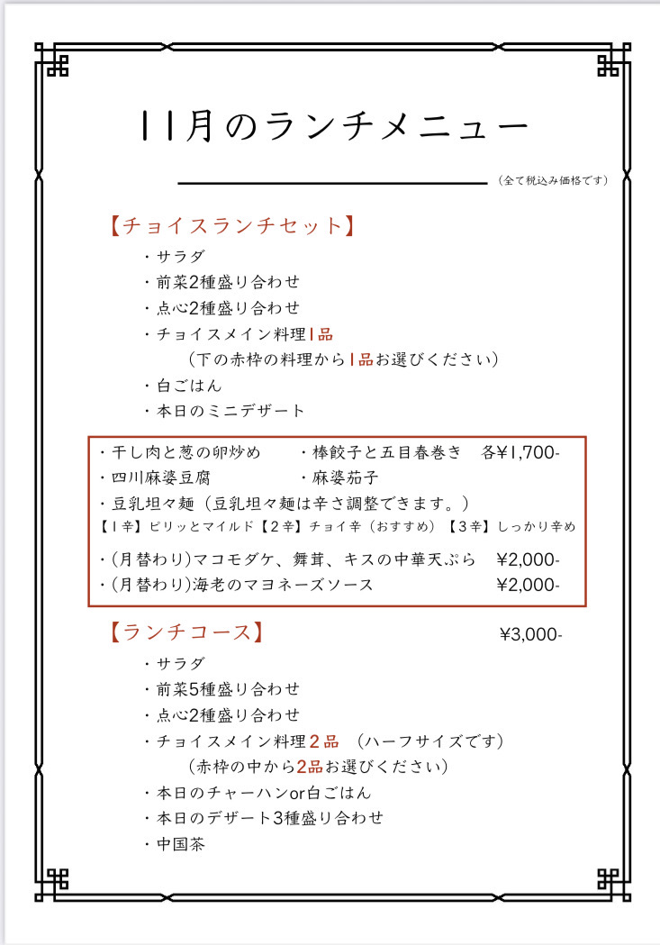 ランチメニュー ホーム タグ: 詳細 エビ料理は、奇数月がエビマヨ、偶数月がエビチリです。 Screenshot 干し肉とねぎの卵炒め 麻婆豆腐 麻婆茄子 豆乳坦々麺 エビのチリソース マコモダケ・舞茸・キスの中華天ぷら 投稿者 chuka.suijinsai@gmail.com 2025年1月6日グランドオープン!! 中華料理のみならず、お酒が好きな方、 落ち着いた空間で過ごしたい方、特別な日のお食事 今日は外食したい!という方などなどどんな方もお待ちしております。 女性が一人でも入りやすいおしゃれな中国料理店です♡ 関連投稿 タグ: 詳細 営業日・営業時間について 2025年2月15日 0 〜休業日〜 毎週火曜日・毎週水曜日のランチ、... タグ: 詳細 果酒・清涼飲料 2024年12月13日 0 果実酒 各税込600円 (ソーダ割り/... タグ: 詳細 ウイスキー・白酒・日本酒 2024年12月13日 0 ウイスキー 白酒 日本酒 ウイスキー ... タグ: 詳細 ビール・紹興酒・焼酎 2024年12月13日 0 shouchu タグ: 詳細 本日のシャーベット 2024年12月13日 0 税込300円 タグ: 詳細 紹興酒アイス 2024年12月13日 0 税込300円 投稿ナビゲーション 前の投稿次の投稿